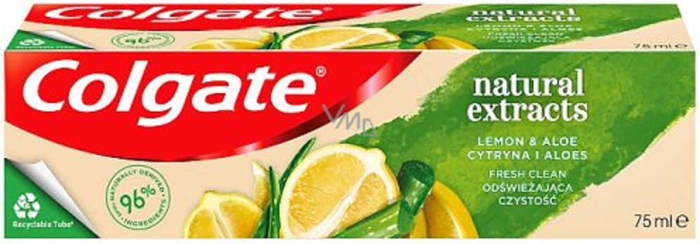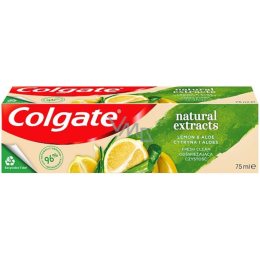 Pasta do zębów Colgate Natural Extracts Cytryna i Aloes przyniesie Ci świeże i czyste uczucie przy każdym myciu. Ta pasta do zębów chroni Twoje zęby i dodatkowo jest w 96 % wykonana z naturalnych składników. Świeży cytrynowy smak orzeźwi Twój oddech, a Ty dzięki niej będziesz czuć pewność siebie przez cały dzień. Oprócz dbania o Twoje zęby firma Colgate robi jeszcze znacznie więcej. Pasta do zębów Colgate Natural Extracts Cytryna i Aloes jest wytwarzana odpowiedzialnie i jest dostarczana w recyklingowym kartonowym opakowaniu oraz tubie, dzięki czemu wiesz, że dbając o swój olśniewający uśmiech, robisz również coś dla planety.