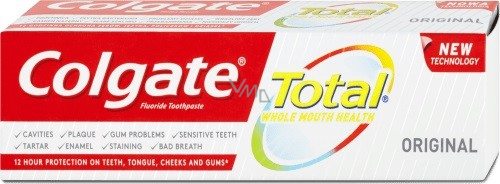 Pasta do zębów Colgate Total Original zapewnia kompleksową ochronę dla czystszej i zdrowszej jamy ustnej. Skutecznie chroni Twoje zęby przed próchnicą i rozwiązuje problemy z wrażliwymi dziąsłami. Jednocześnie pomaga zmniejszyć ilość bakterii na zębach, języku, błonach śluzowych i dziąsłach.