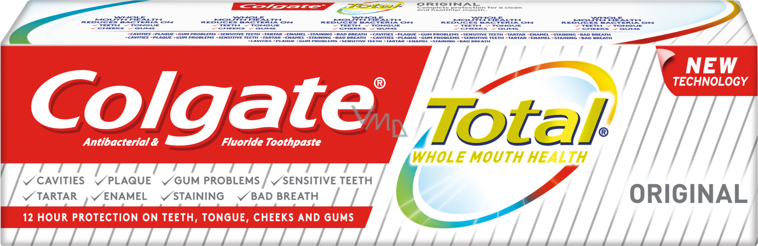 Pasta do zębów Colgate Total Original gwarantuje całkowitą ochronę dla twoich ust. Pasta zapewni ci czystsze i zdrowsze usta. Jednocześnie skutecznie chroni twoje zęby przed próchnicą i rozwiązuje problemy z wrażliwymi dziąsłami. Dodatkowo bardzo skutecznie zmniejsza ilość bakterii na zębach, języku, błonach śluzowych i dziąsłach. Całkowitą ochronę antybakteryjną i skuteczną walkę z chorobami zębów i dziąseł pasta zapewni aż na 12 godzin. Pasta do zębów Colgate Total jednocześnie pomaga znacząco zmniejszyć występowanie zapalenia dziąseł o aż 88%. Skutecznie chroni tym samym usta przed działającymi negatywnie substancjami. Dlatego pasta do zębów Colgate Total Original jest właściwym krokiem w kierunku zdrowych zębów i dziąseł, a pasta do zębów Colgate Total 12.