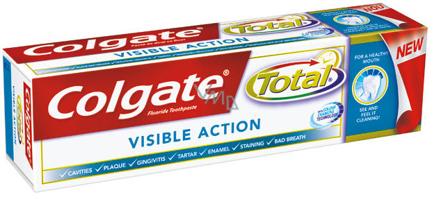 Pečuje lépe o vaši ústní dutinu s Colgate Total. Při čištění zubů zubní pastou s technologií aktivní pěny dochází k přeměně z bílé pasty na modrou pěnu. Brání vytváření bakterií mezi čištěním zubů, dodává pocit perfektně vyčištěných zubů.