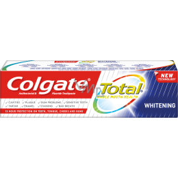 pasta do zębów Colgate Total Whitening przede wszystkim efektywnie usuwa plamy z Twoich zębów, czyści zęby z płytki nazębnej i pomaga im przywrócić ich pierwotną biel. Dodatkowo chroni zęby przed próchnicą i rozwiązuje problemy z wrażliwymi dziąsłami. Jednocześnie zapewnia również zmniejszenie ilości bakterii na zębach, języku, błonach śluzowych i dziąsłach. Dzięki kompletnemu składowi pasty do zębów Colgate Total Whitening pasta może zapewnić do 12 godzin ochrony. Pasta zapewnia świeży oddech.