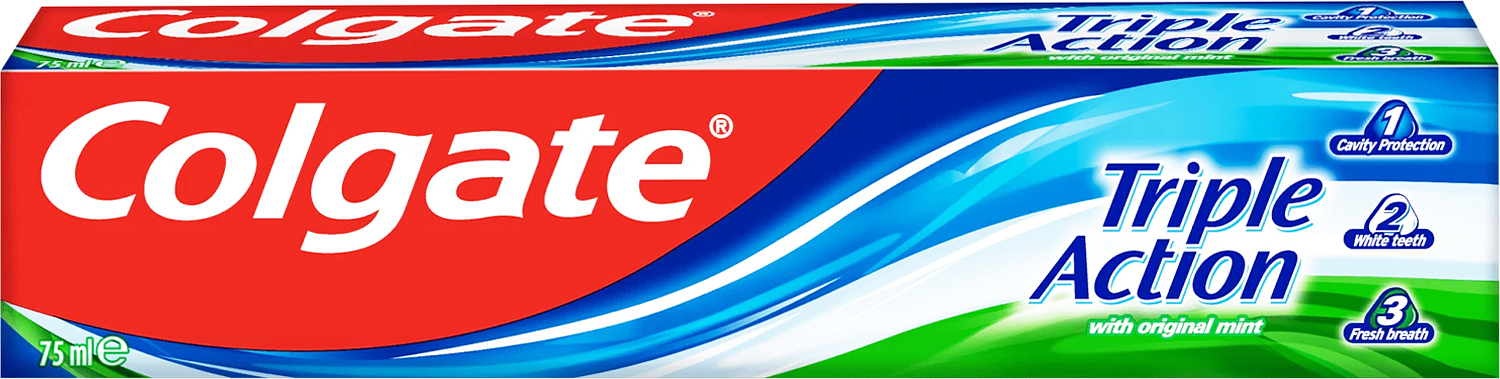 Pasta do zębów Colgate Triple Action Original Mint zapewnia długotrwały świeży oddech. Pomaga chronić przed bakteriami powodującymi próchnicę, redukuje powstawanie bakterií powodujących żółknięcie zębów i pomaga chronić przed bakteriami powodującymi nieprzyjemny zapach z ust.