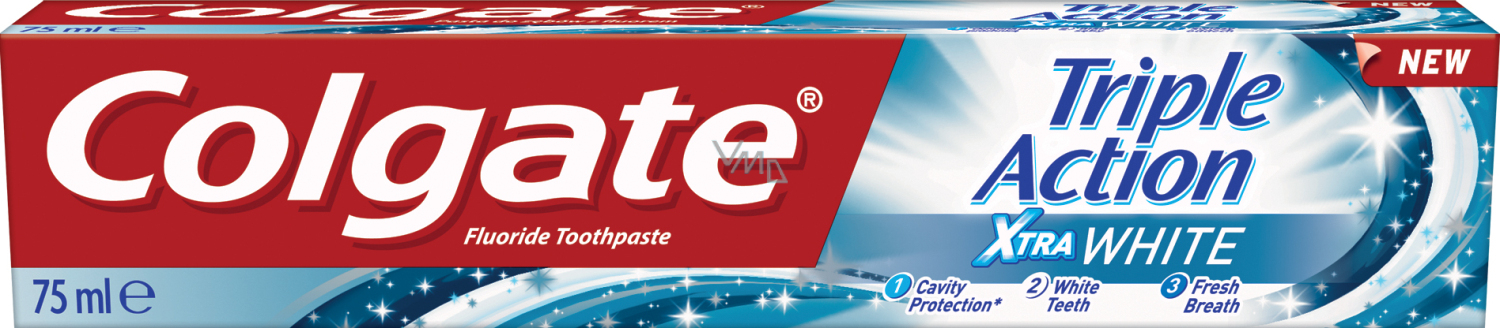 Colgate Triple Action Xtra White to wybielająca pasta do zębów z czyszczącymi mikroskopijnymi cząstkami do dodatkowego usuwania plam.