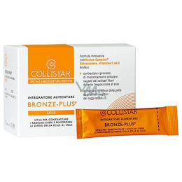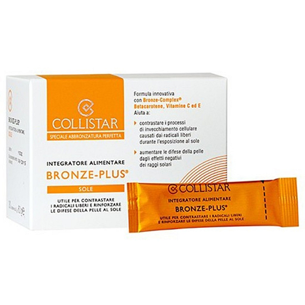 Řešení Collistar: Doplněk stravy, který působí na dvou frontách. Na jedné straně poskytuje tělu v dostatečné výši základní antioxidanty pro posílení obrany pokožky zevnitř. Na druhé straně, stimuluje tvorbu melaninu pro rychlejší a trvalejší opálení. Bronze-Plus obsahuje unikátní Bronz-Complex, který v kombinaci se směsí antioxidantů poskytuje dokonalé opálení bez rizika pro pokožku.