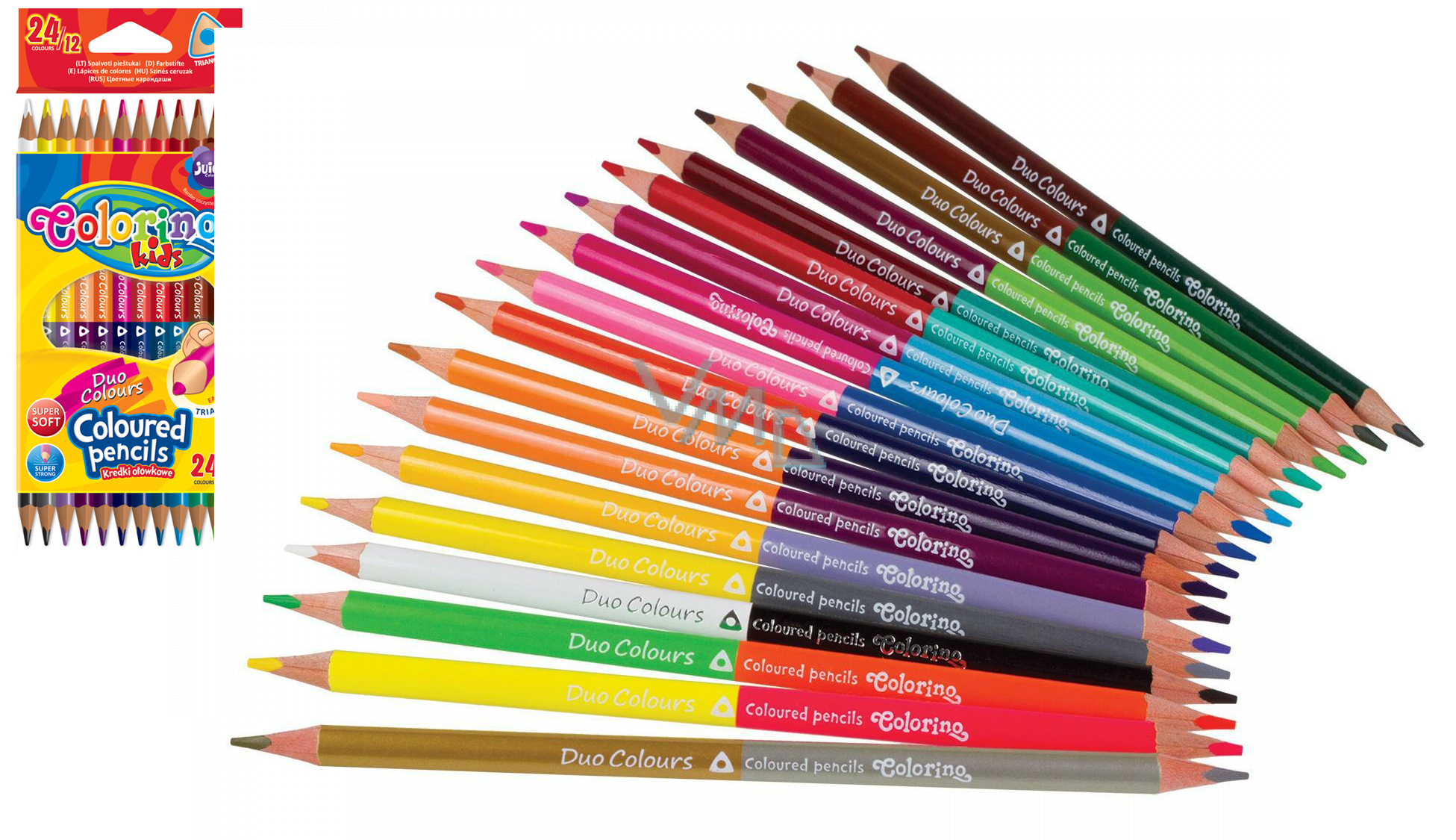 Wysokiej jakości kredki w ergonomicznym kształcie do prawidłowego trzymania. Ekstra miękkie rysowanie intensywnymi kolorami dzięki wysokiej zawartości pigmentów. Rdzeń kredki jest klejony na całej długości - ekstra odporny na łamanie. Końcówki są niezwykle odporne na nacisk na papier. Łatwe ostrzenie. Zestaw 12 dwustronnych kredek = 24 kolory.