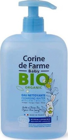 Micelární mycí voda na tělo a vlasy. Corine de Farme Baby Bio Organic je speciálně navržena pro potřeby citlivé dětské pokožky. Jemná mycí voda šetrně čistí citlivou dětskou pokožku, jemné dětské vlasy a chrání pokožku před vysušením. Přírodní, Hypoalergenní složení obohacené o extrakt z organických olivových listů respektuje přirozenou rovnováhu pokožky malých i velkých a zanechává ji vláčnou, hydratovanou a hedvábně hebkou se svěžím pocitem. Vyzkoušejte jemnou micelární mycí vodu na tělo a vlasy Corine de Farme Baby Bio Organic, vhodnou od narození!