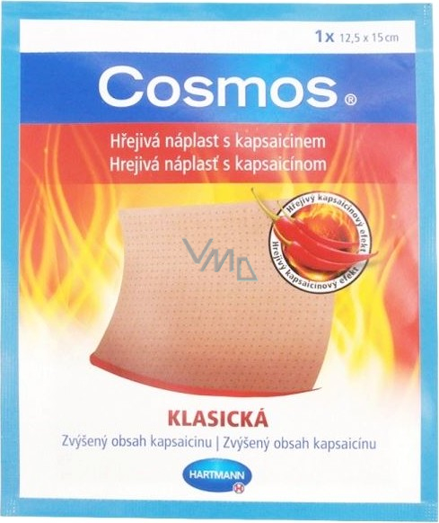 Doporučení: Pokud vás tato náplast příliš hřeje, vyzkoušejte náplast Cosmos Hřejivá náplast s kapsaicinem jemná. Tato náplast má snížený obsah kapsaicinu.