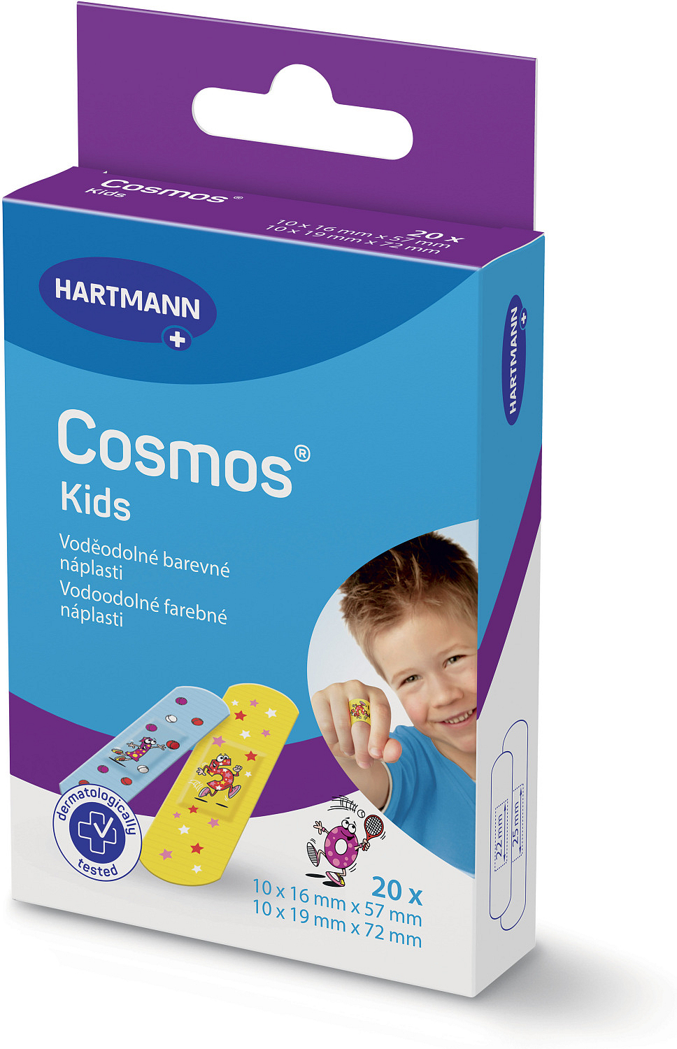 Opakowanie zawiera 20 podzielonych plastrów w dwóch rozmiarach z dziecięcymi motywami. Do optymalnej pielęgnacji małych ran idealnym asortymentem plastrów Cosmos, który jest doskonale dostosowany do Twoich potrzeb. Plastry Cosmos przepuszczają powietrze i dzięki hypoalergicznemu klejowi nałożonemu w paski są delikatne dla skóry.