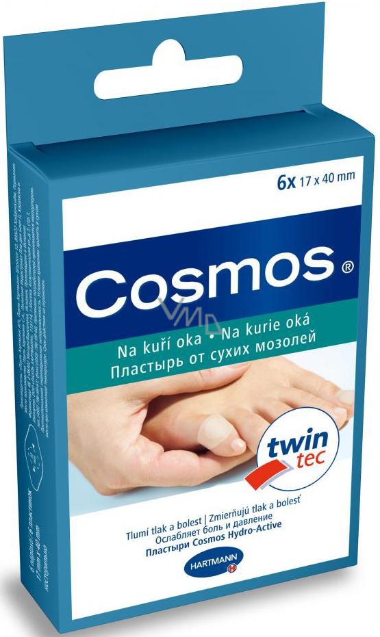 Celohydrokoloidní náplast Cosmos Na kuří oka se dvěma vrstvami hydrokoloidů chrání dvojnásobně kuří oko před nepříjemným tlakem a třením a účinně tlumí bolest. Léčivý hydrokoloidní polštářek vytváří na kuřím oku vlhký gel, který kuří oko změkčuje a usnadňuje jeho odstranění. Hydrokoloidní vrstva nacházející se na lepicí části náplasti zabraňuje podráždění zdravé pokožky. Náplast dobře drží, je průsvitná a můžete ji nosit i několik dní bez nutnosti výměny.