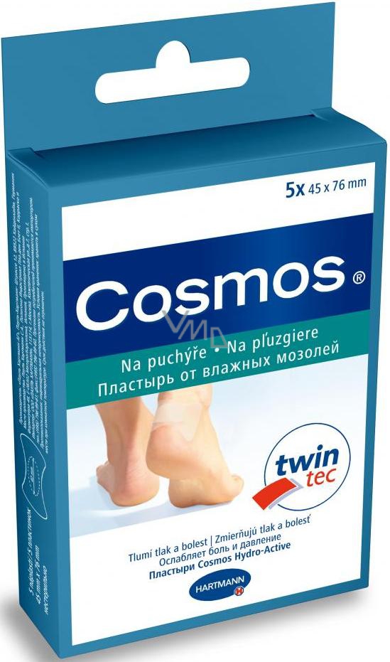Celohydrokoloidní náplast Cosmos Na puchýře se dvěma vrstvami hydrokoloidů chrání dvojnásobně puchýř před nepříjemným tlakem a třením a účinně tlumí bolest. Léčivý hydrokoloidní polštářek vytváří na puchýři vlhký gel, ve kterém se puchýř rychleji a lépe hojí. Hydrokoloidní vrstva nacházející se na lepicí části náplasti zabraňuje podráždění zdravé pokožky. Náplast dobře drží, je průsvitná a můžete ji nosit i několik dní bez nutnosti výměny.