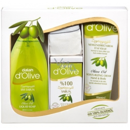 Dalan d Olive tekuté mýdlo 400 ml + toaletní mýdlo 150 g + zvláčňující krém 250 ml + žínka, kosmetická sada