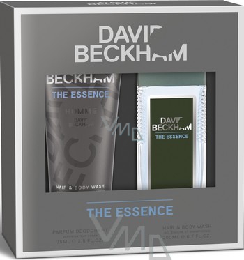Vůně The Essence našla inspiraci u Davidova osobitého stylu a ducha a představuje se v jemně zaobleném pravoúhlém skleněném flakonu s vyraženým proplétaným vzorem. Flakon je zakončen elegantním stříbrným uzávěrem, který je zdobený šikmým šachovitým designem evokujícím mocný mužný dojem. Pro stylový kontrast je barva samotné vůně ocelově modrá. Celkový moderní vzhled dokončuje přední strana flakonu, na níž je embosované nové logo David Beckham: jméno napsané tučným písmem s kruhovým tvarem prokopnutého míče. Kovově šedá krabička vyzařuje energickou eleganci.