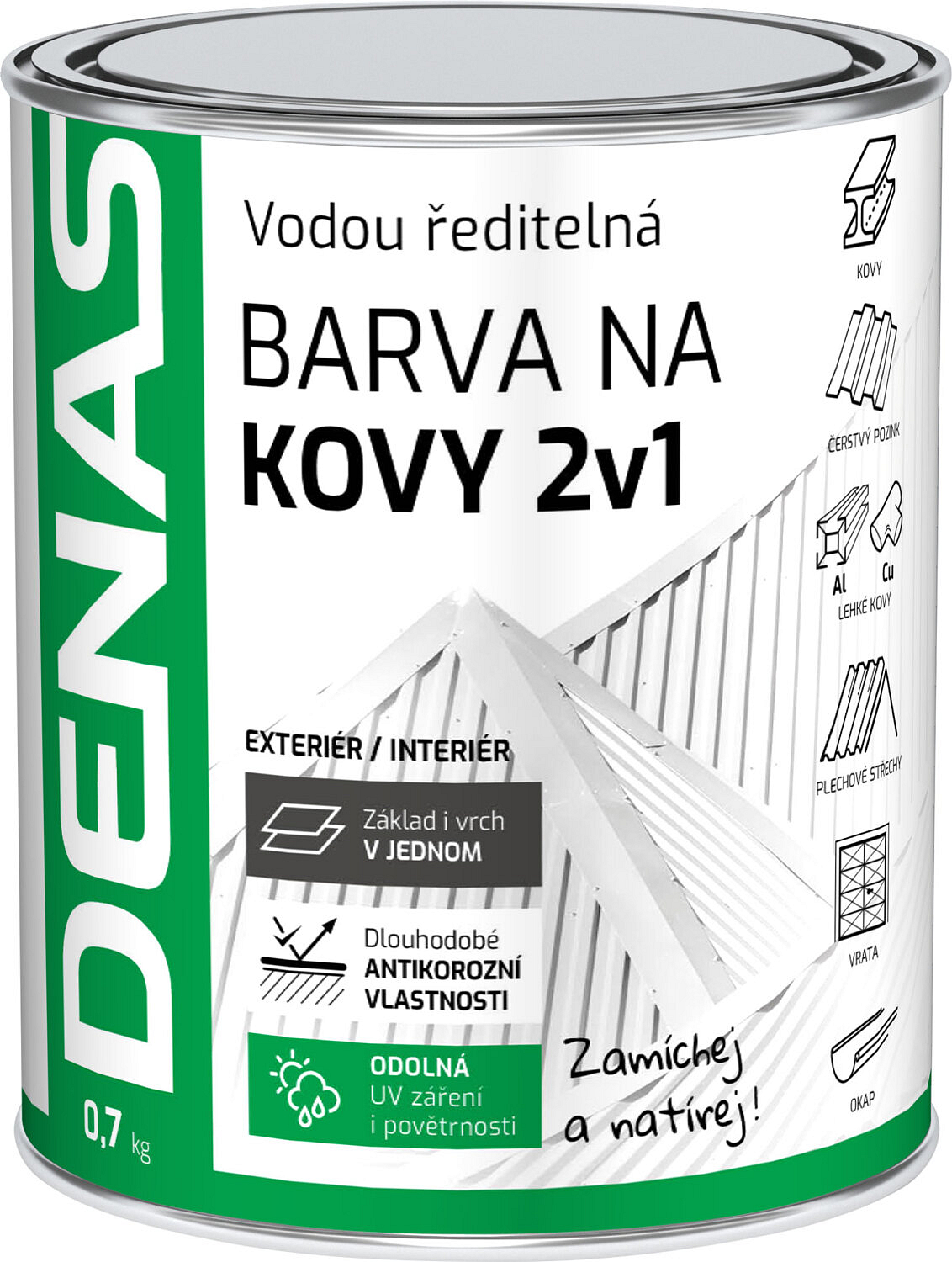 DENAS METAL 2v1 to samopodkładowa, półmatowa, antykorozyjna, farba rozcieńczalna wodą przeznaczona do ochrony wszystkich metalowych podkładów. Powłoki mają ochronę antykorozyjną w całej grubości powłoki, wysoką odporność na działanie warunków atmosferycznych, stabilność UV. Farba do metalu DENAS 2v1 jest idealna do wykończeń powierzchni dachów, konstrukcji metalowych, elementów blacharskich, ogrodzeń, bram, parapetów, masztów, balustrad oraz wyrobów z żeliwa. Doskonale chroni stalowe, żelazne, świeżo ocynkowane, aluminiowe i miedziane powierzchnie umieszczone na zewnątrz i wewnątrz. Powłoki szybko schną, mają doskonałą przyczepność do metalowych podkładów, są wysoko kryjące, mają doskonałe rozprowadzanie, łatwo się aplikuje.