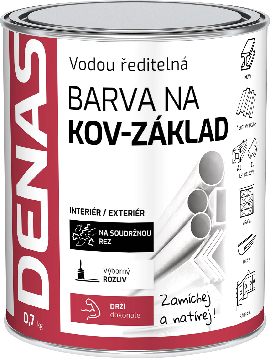 DENAS NA KOV-ZÁKLAD podstawowa ochrona antykorozyjna żelaza, aluminium, miedzi, cynku. DENAS podstawowa farba antykorozyjna na metal (wcześniej DENAS ANTIKOR) to farba rozcieńczalna wodą do nowych oraz renowacyjnych powłok z zwiększoną ochroną przed korozją. Farba jest odpowiednia do malowania konstrukcji i blach stalowych, żelaznych, aluminiowych oraz świeżo ocynkowanych, blach dachowych, ich elementów dekarskich, poręczy, ogrodzeń, słupów i innych metalowych wyrobów umieszczonych w eksterierze i interierze. Nadaje się również na świeżą miedź. Wykazuje bardzo szybkie schnięcie, doskonałą przyczepność do metalowych podkładów, krycie i obróbkę.