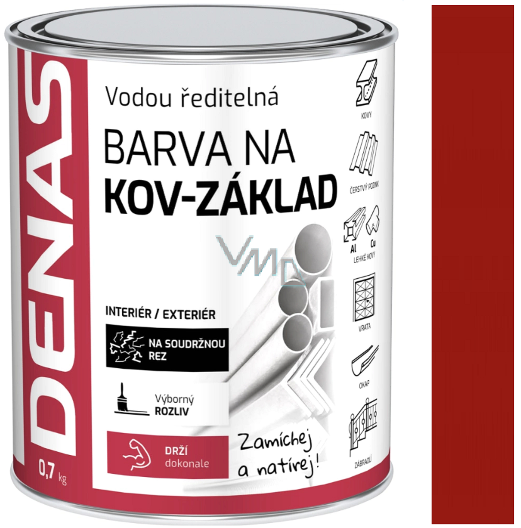 Denas na kov je základní antikorozní ochrana Železa, hliníku, mědi, pozinku. Barva je vodou ředitelná pro nové i renovační nátěry se zvýšenou korozní ochranou. Je vhodná k nátěrům ocelových, železných, hliníkových i čerstvě pozinkovaných konstrukcí a plechů, plechových střech, jejich klempířských prvků, zábradlí, plotů, sloupů a dalších kovových výrobků umístěných v exteriéru i interiéru. Je vhodná také na čerstvou měď. Vykazuje velmi rychlé zasychání, výbornou přilnavost na kovových podkladech, kryvost i zpracovatelnost.