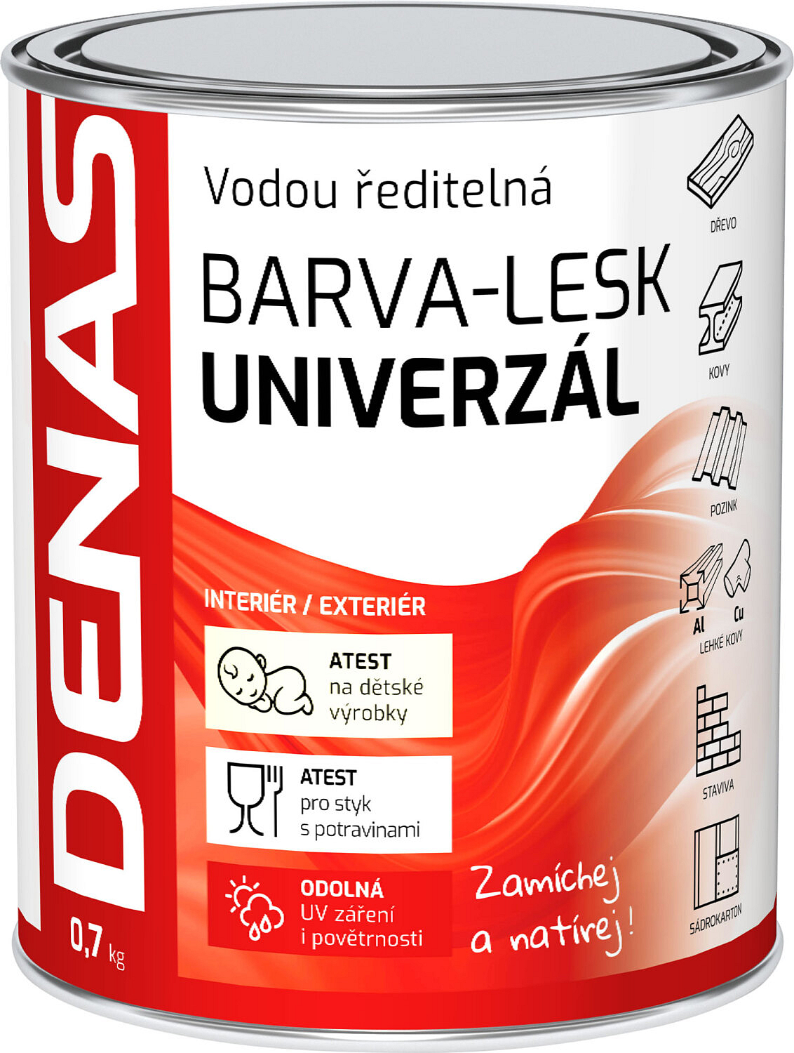 DENAS UNIVERZÁL to wierzchnia, wodoodporna farba do malowania elementów budowlanych i konstrukcji z drewna, metalu, materiałów budowlanych, świeżo ocynkowanej blachy, oraz ocynkowanych dachówek, aluminium, niektórych rodzajów plastiku, umakartu, ceramicznych płytek z dodatkiem silanu, gipskartonu. Spełnia normy dotyczące powierzchniowych wykończeń produktów oraz zabawek dla dzieci od 0-3 lat (ČSN EN 71, część 3) i jest odpowiednia do kontaktu z żywnością. Powłoki mają doskonałą odporność, nie kredowieją ani nie kruszeją pod wpływem promieniowania UV i warunków atmosferycznych, są odporne na działanie środków czyszczących używanych w gospodarstwie domowym. Malowane powierzchnie są ekstremalnie odporne mechanicznie i wykazują długą żywotność zarówno w pomieszczeniach, jak i na zewnątrz.