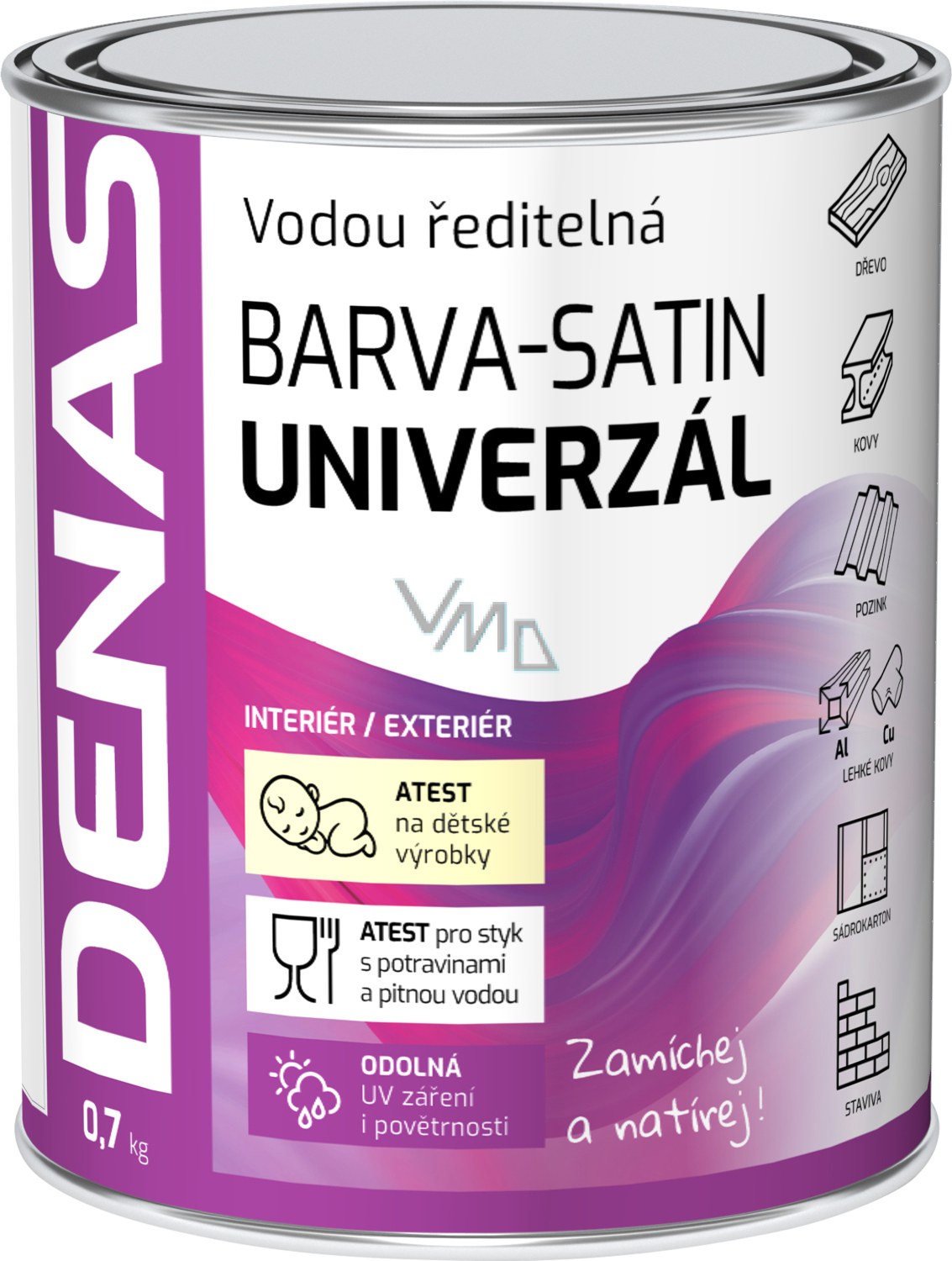 DENAS UNIVERZÁL SATIN je polomatná vrchní vodou ředitelná barva na nátěry stavební prvků a konstrukcí ze dřeva, kovu, staviv, čerstvého pozinkovaného plechu i pozinkovaných střešních šablon, hliníku, některých druhů plastů, umakartu, keramických obkladů s přídavkem silanu, sádrokartonu. Splňuje normu povrchových úprav výrobků a hraček pro děti od 0-3 let (ČSN EN 71, část 3) a je vhodný pro styk s potravinami. Nátěry mají vynikající odolnost, nekřídují, ani nekřehnou vlivem působení UV záření a povětrnosti, jsou odolné působení čisticích přípravků užívaným v domácnosti. Natřené povrchy jsou extrémně mechanicky odolné a vykazují dlouhou životnost v interiéru i exteriéru.