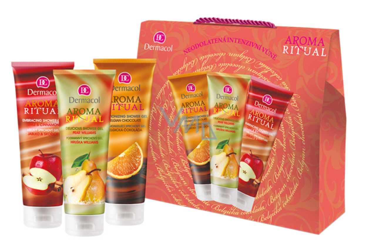 Dermacol Aroma Ritual Jablko se skořicí sprchový gel 250 ml + Hruška Williams sprchový gel 250 ml + Belgická čokoláda sprchový gel 250 ml, kosmetická sada