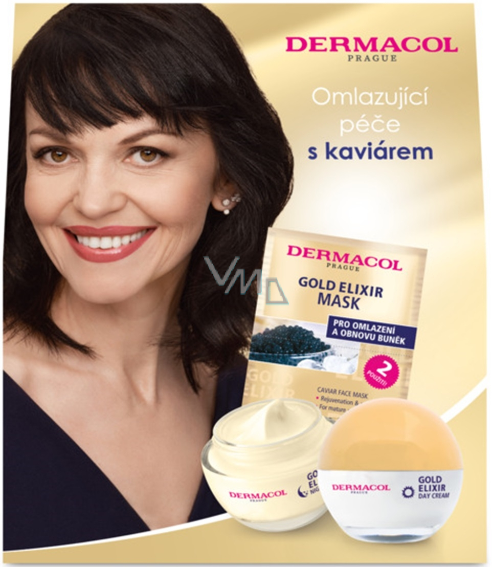Gold Elixir omlazující kaviárový denní krém. Poklesem hormonální aktivity pleť ztrácí svoji pevnost a pružnost, dochází k narušení její buněčné struktury. Laboratoře Dermacol proto vyvinuly speciální kaviárovou denní péči pro velmi zralou pleť s výtažkem z kaviáru, která obnovuje a regeneruje buněčnou strukturu pleti a zpomaluje proces stárnutí. Extrakt z cibulky narcisu vyrovnává hluboké vrásky, zpevňuje pleť a zvyšuje její elasticitu. Omega 3 a 6 mastné kyseliny vyživují suchou pleť a napomáhají při obnově kožní bariéry. Ušlechtilé oleje s bambuckým máslem zvláčňují pleť. UV filtry společně s beta-karotenem a vitaminem E chrání pleť před škodlivými vlivy slunečního záření.