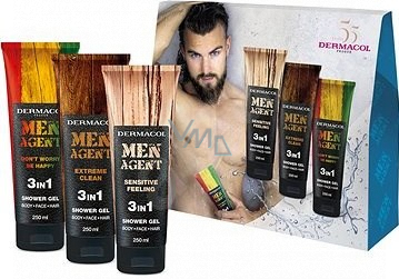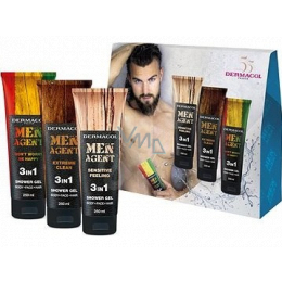 Dermacol Men Agent 3v1 Sensitive Feeling sprchový gel 250 ml + 3v1 Extreme Clean sprchový gel 250 ml + 3v1 Dont worry be happy sprchový gel, kosmetická sada pro muže