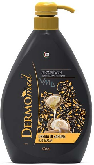 Dermomed Arganový olej krémové tekuté mýdlo s přírodními extrakty zjemňuje a vyživuje pokožku rukou. Jemná vůně a složení dodávají pokožce pocit hydratace a výživy.