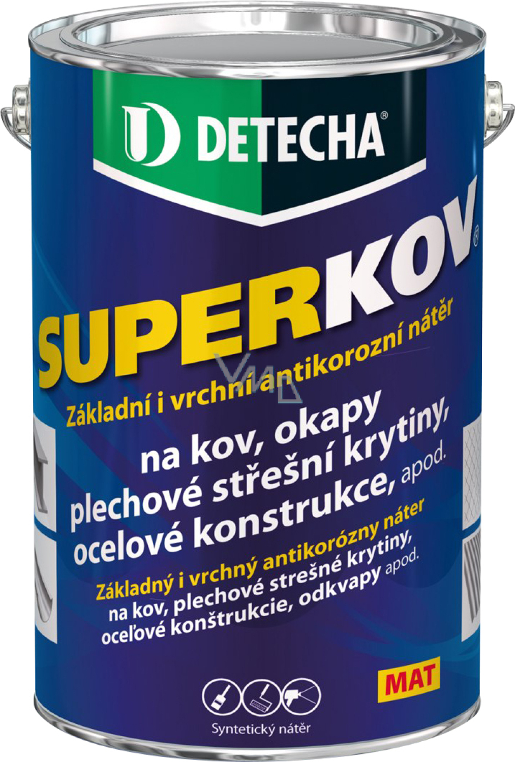 Podkład i wierzchnia farba antykorozyjna syntetyczna do metalu przeznaczona do wykończenia materiałów metalowych oraz do ich skutecznej ochrony przed korozją. Tworzy wysoki efekt barierowy przeciwko długotrwałemu działaniu warunków atmosferycznych i promieniowania słonecznego. Do długotrwałej ochrony (nawet do 8 lat) wystarczą 2 - 3 warstwy Superkovu bez wcześniejszego podkładu. SUPERKOV jest podkładem i wierzchnim antykorozyjnym powłoką do metalu, blaszanych pokryć dachowych, konstrukcji stalowych, rynien itp.