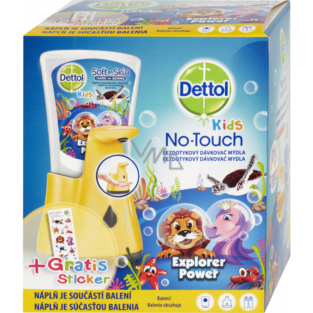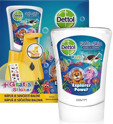 Dettol bezdotykový dávkovač mýdla + tekuté mýdlo Dettol Kids Dobrodruh náplň do bezdotykového dávkovače. Jednoduché a praktické použití. Bezdotykový dávkovač mýdla Dettol pomůže vašim dětem mýt si ruce. Ruce musí být umístěny přímo pod dávkovač a správné množství mýdla se do nich automaticky nadávkuje. Příjemná vůně mýdla vytvoří pro malé děti z mytí rukou opravdový zážitek. Naše složení účinně myje ruce, ale zároveň je jemné na kůži. Přiložené nálepky umožňují dodatečný design dávkovače a zařídí zábavnou aktivitu.