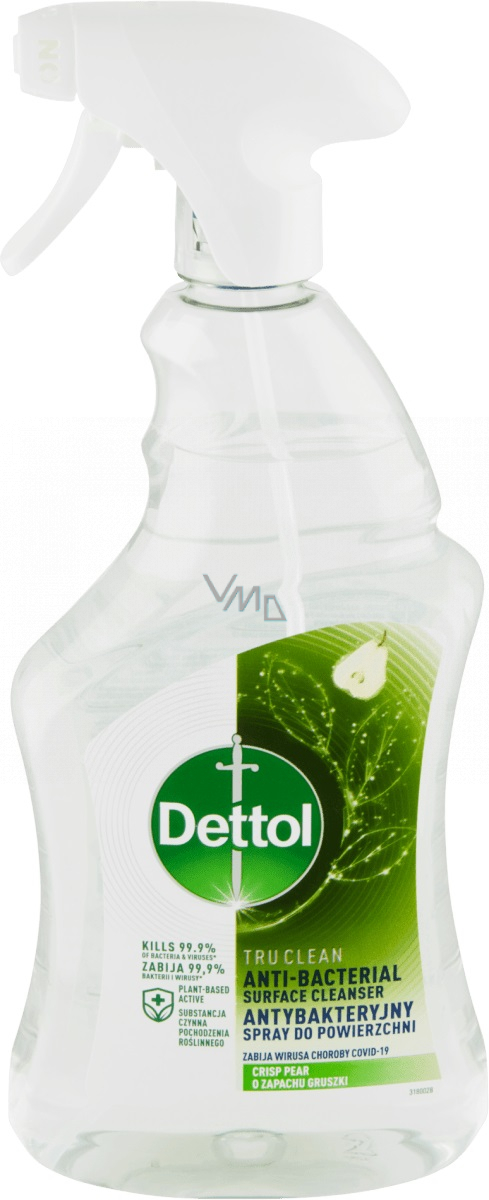 Dettol antibakteriální sprej na povrchy s vůní hrušky, který čistí a desinfikuje plochy ve vaší domácnosti. Odstraňuje 90% alergenů (travní pyly, roztoče z prachu v domácnostech, chlupy domácích zvířat, např. psí a kočičí chlupy). Zároveň ničí 99,9 % bakterií a virů včetně viru COVID-19 a zachovává svěží vůni.