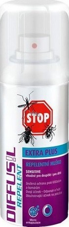 Diffusil repelent Extra Plus je repelentní mléko určené k aplikaci na pokožku. Díky nové technologii - microenkapsulace účinných látek - zajišťuje vysokou a dlouhotrvající ochranu proti klíšťatům a komárům - až 8 hodin. Nový technologie umožňuje také použití pro děti od věku 3 let. Díky patentovanému složení odpuzuje hmyz a zároveň vykazuje i hubící účinek na hmyz při styku s pokožkou, což je výhodou především v ochraně proti klíšťatům. Dle potřeby aplikaci opakujte.