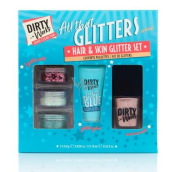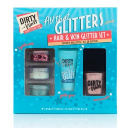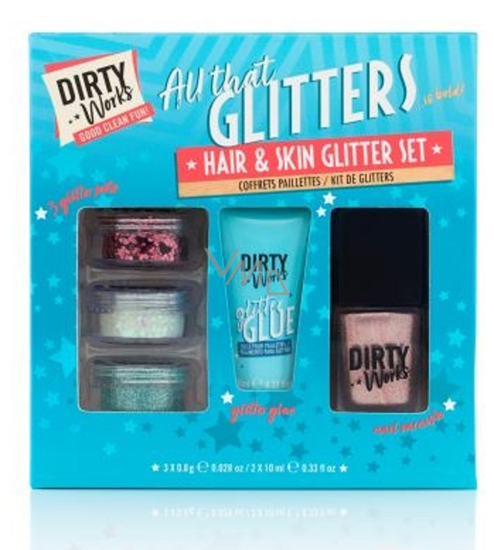 Dirty Works All That Glitters kalíšek se třpytkami 3 x 0,8 g + lepidlo na třpytky 10 ml + lak na nehty 10 ml, kosmetická sada