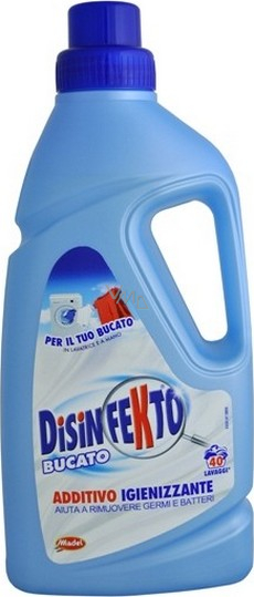 Antibakteriální přísada k pracímu prostředku Disinfekto Bucato je speciální doplněk, který zajišťuje dokonalou hygienu vašeho prádla. Disinfekto Bucato 1l je doplněk k pracímu přípravku s hygienizujícím účinkem, který pomáhá odstraňovat bakterie a choroboplodné zárodky. Vhodný na všechny typy prádla (bílé i barevné), do pračky i na ruční praní. Účinný již od 30°C. Neobsahuje fosfor.