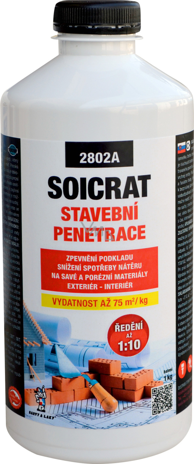 Uniwersalna powłoka penetracyjna na pochłaniające podłoża (tynk, beton, drewno itp.) w celu zmniejszenia pochłaniania i jednoczesnego poprawienia przyczepności górnej powłoki farby dyspersyjnej (Latex, Bakrylex email, Barlet akrylowy, Bakrylex lak). Również poprawia właściwości zapraw i betonów. Penetracja budowlana Soicrat nakłada się na suche, pozbawione pyłu i zanieczyszczeń podłoże w jednej lub dwóch warstwach (w zależności od pochłaniania podłoża). Górną powłokę farbą można stosować po wyschnięciu warstwy penetracyjnej. W zależności od pochłaniania i stanu wzmacnianego podłoża można rozcieńczyć w stosunku 1 część penetracji do 3-10 części wody.