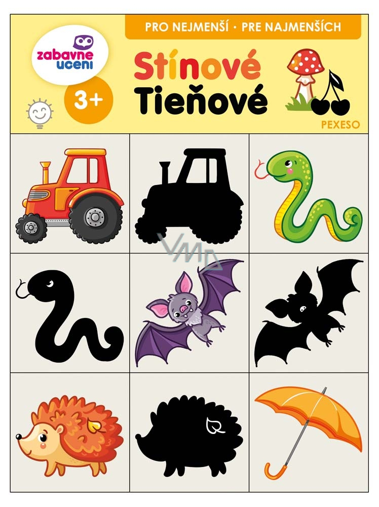 Najděte správný stín k vybranému obrázku. Motivy zvířátek, hříbku, ovoce a traktoru.