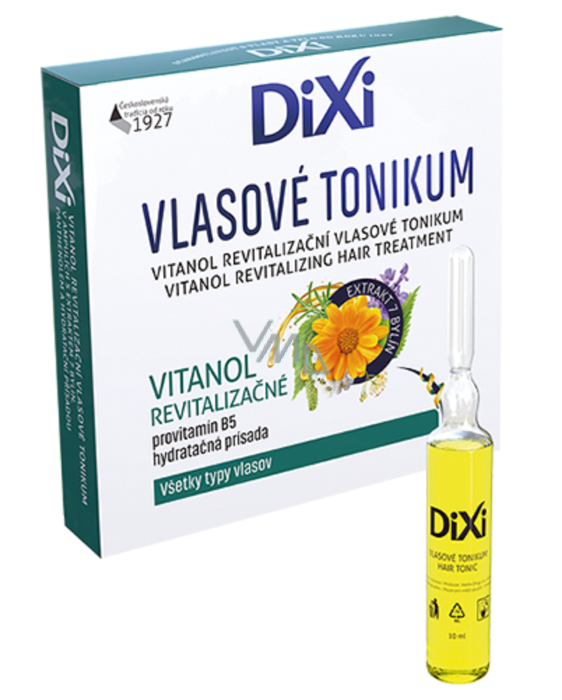 Revitalizačné vlasové tonikum Dixi Vitanol na růst vlasů brání vypadávání a podporuje jejich růst. Díky přírodním extraktům a vitaminům budou vaše vlasy zářit krásou a vitalitou. Účinné látky jako extrakty z břízy, kopřivy, lípy, řebříčku, měsíčku, rozmarýnu a levandule, provitamín B5 (panthenol), vitamín F a hydratační přísada poskytuji komplexní péči a výživu pro vlasy a pokožku hlavy.
