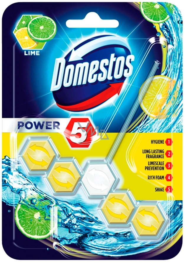 Twardy blok WC Domestos Power 5 zapewnia Twojej toalecie kompleksową pielęgnację, jest bardzo skutecznym zawiesznym środkiem czyszczącym w postaci pięciu kulek. Zapobiega powstawaniu kamienia, tworzy bogatą pianę, zapewnia czysty powierzchnię muszli toaletowej z widocznym połyskiem i wreszcie pozostawia higieniczną czystość oraz długotrwały połysk przy każdym spłukiwaniu.