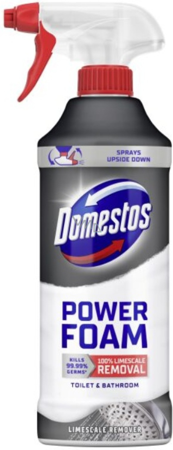 Domestos Power Foam je účinná čisticí pěna ve spreji určená k odstranění vodního kamene, nečistot a bakterií v domácnosti. Díky husté pěně snadno přilne na povrchy i ve svislé poloze a umožňuje účinné čištění bez drhnutí. Působí rychle a efektivně na toalety, umyvadla, vany, sprchové kouty a další hladké povrchy.