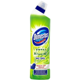 Nyní s novou inovativní multi tryskou, díky které se Domestos WC gel snadno aplikujete i do špatně dostupných míst, což umožňuje přípravku lépe likvidovat špínu, bakterie i vodní kámen. Vytváří tak ochranný štít mezi jednotlivými čištěními.