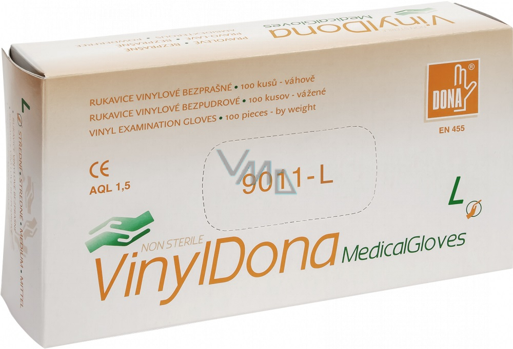 Dona Vinyldona rukavice vinylové nepudrované bezprašné, velikost L 100 kusů v krabici