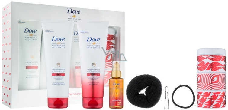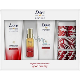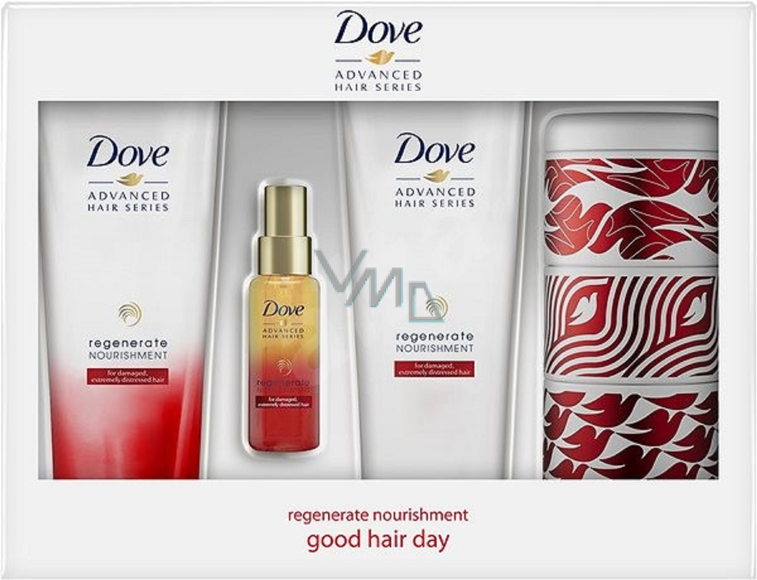 Dárková sada pro ženy DOVE Good Hair Day prémiová dárková kazeta je určena pro každodenní péči o vlasy poškozené častým barvením, vlasy chemicky ošetřené a poškozené teplem. Sada obsahuje šampon, kondicionér, sérum, dárek a prémiový box. Jedinečné kosmetické produkty řady Advanced Hair Series Regenerate Nourishment vyživují, regenerují a zmírňují příznaky i silně poškozených vlasů.
