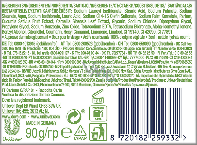 Sodium Lauroyl Isethionate, Stearic Acid, Sodium Palmitate, Sodium Stearate, Aqua, Sodium Isethionate, Lauric Acid, Sodium C14-16 Olefin Sulfonate, Sodium Palm Kernelate, Parfum, Cucumis Sativus Fruit Extract, Camellia Sinensis Leaf Extract, Glycerin, Sodium Chloride, Dipropylene Glycol, Zinc Oxide, Tetrasodium EDTA, Propylene Glycol, Citric Acid, Tetrasodium Etidronate, Sodium Benzoate, Alumina, Alpha-Isomethyl Ionone, Benzyl Alcohol, Butylphenyl Methylpropional, Citronellol, Coumarin, Hexyl Cinnamal, Limonene, Linalool, CI 19140, Cl 42090, Cl 77891.