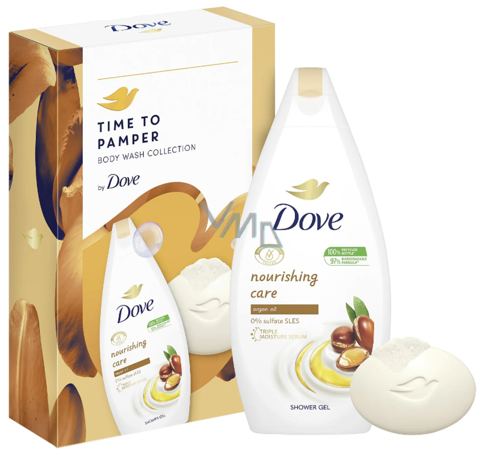 Dove Nourishing Care Argan Oil żel pod prysznic 250 ml + Nourishing Moroccan Argan Oil kremowe mydło w kostce z olejem arganowym 90 g, zestaw kosmetyczny