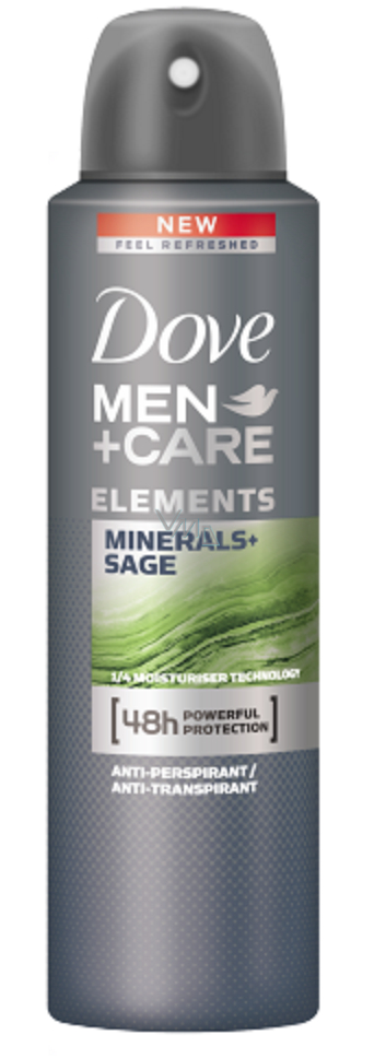 Dove Elements Minerals & Sage antiperspirant ve spreji vás chrání 48 hodin proti potu a zápachu a chrání vaši pokožku. Obsahuje přírodní minerály a šalvěj. Okamžitě zasychá a nedráždí pokožku.