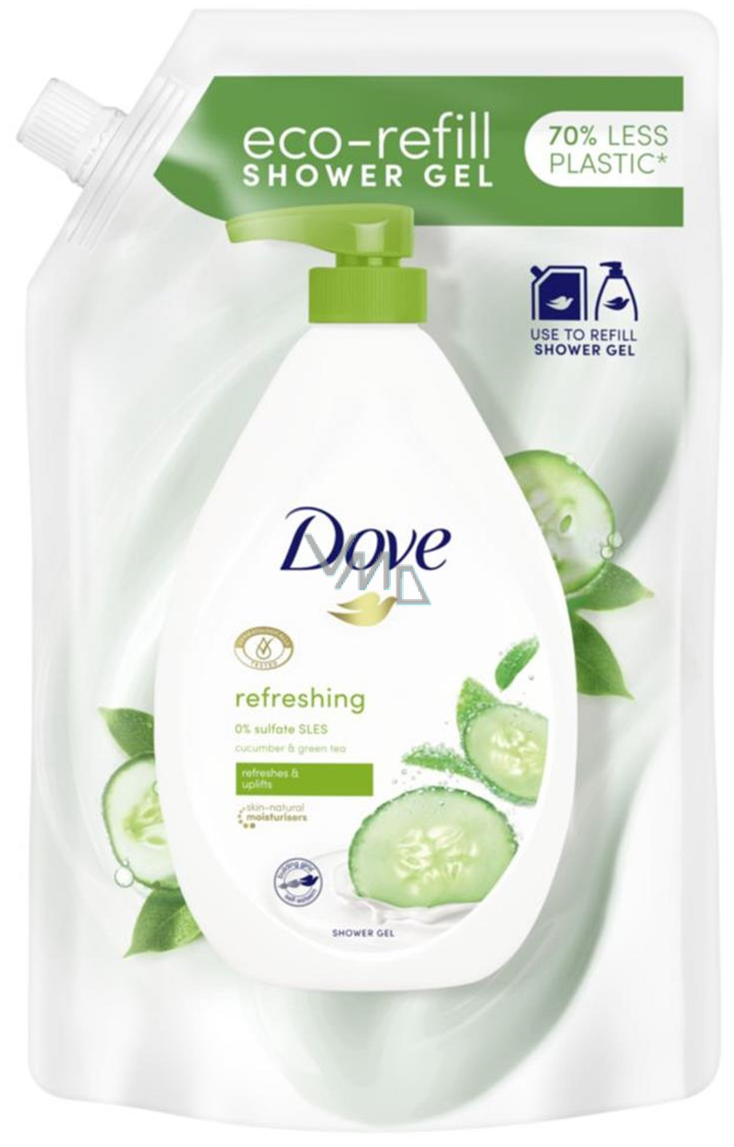 Dove Refreshing sprchový gel náhradní náplň je šetrný k přírodě, jelikož jsme na jeho výrobu použili až o 70 % méně plastu. Osvěžující sprcha může být tím správným začátkem každého dne, se správným sprchovým gelem můžete zároveň vaši pokožku hydratovat. Dove refreshing sprchový gel s vůní okurky a zeleného čaje s obsahem šetrných čistících složek zanechá vaši pokožku krásně hydratovanou a svěží. Pro krásně jemnou a hebkou pokožku!