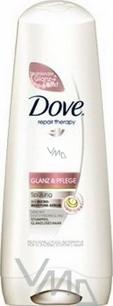 Dove Repair Therapy Glanz & Pflege kondicionér pro zářivě lesklé vlasy. Zanechává vlasy přirozeně krásné, sametově jemné a lesklé. Obsahuje Micro Moisture sérum, které vyživuje povrch vlasů, zanechává je zářivě lesklé, uhlazené a odolné proti dalšímu poškození.