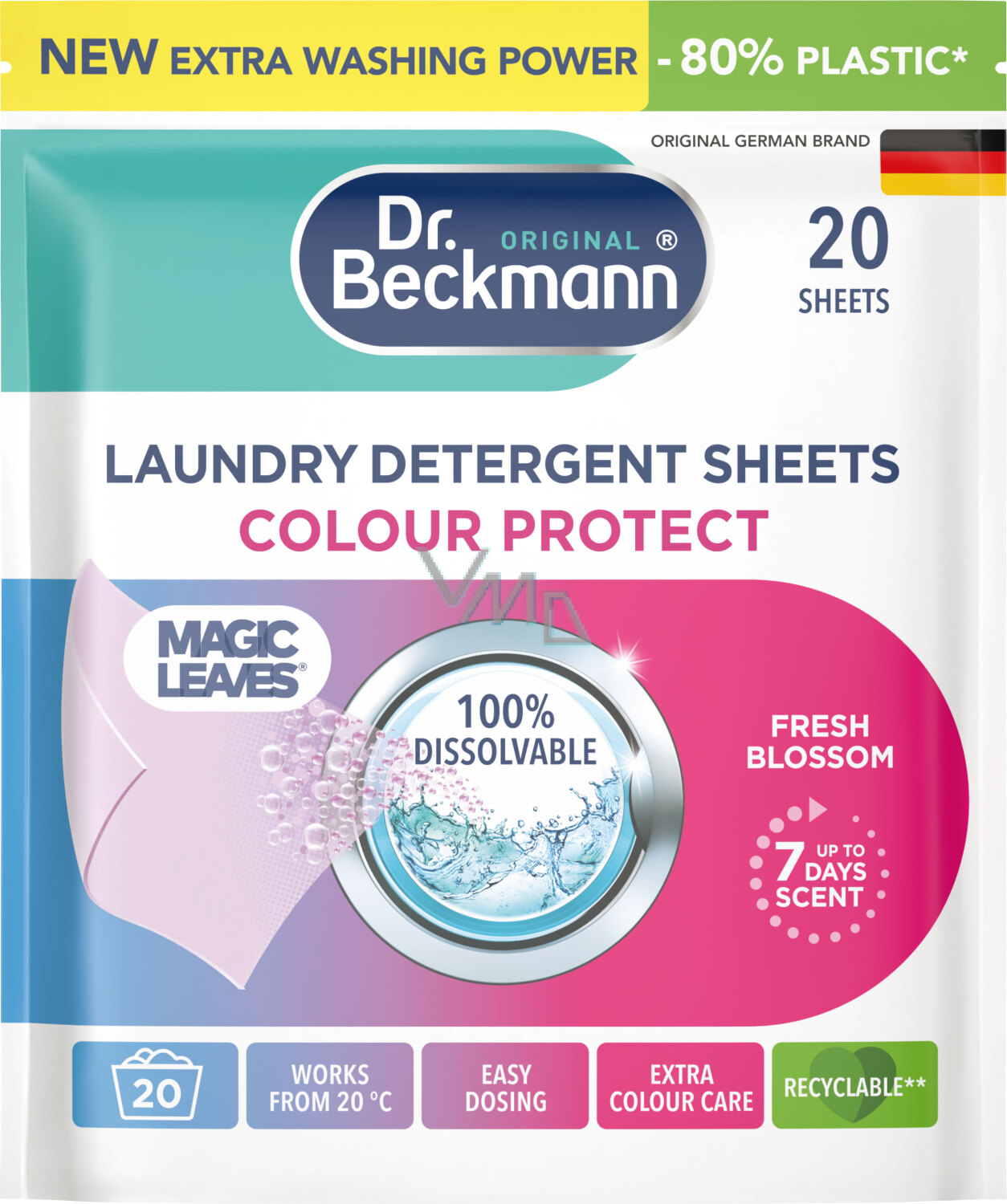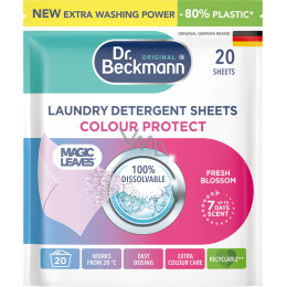 Dr. Beckmann chusteczki do prania Magic Leaves Fresh Blossom Color to środek piorący lekki jak piórko, który sprawi, że pranie będzie jeszcze wygodniejsze. Jedna chusteczka rozpuszczalna w wodzie zapewnia głęboką czystość i intensywne kolory, nawet w niskich temperaturach.