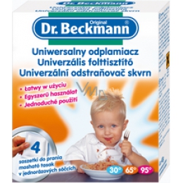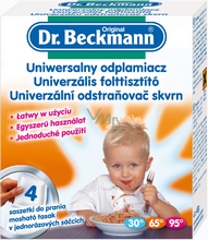 Dr.Beckmann univerzální odstraňovač skvrn je velmi silné rozpouštědlo mastnoty. Enzymy a aktivní kyslík odstraňují obtížně odstranitelné skvrny od mastnoty, barevné skvrny (káva, čaj, červené víno, ovoce, atd.), proteinové skvrny (krev, mléko) a škrobové skvrny, zároveň pečuje o všechny druhy oděvů.