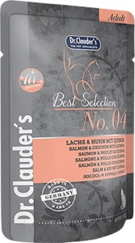 Dr. Clauders Best Selection No. 4 Kuřecí maso, losos a quinoa kompletní krmivo s kousky masa pro kočky kapsička 85 g