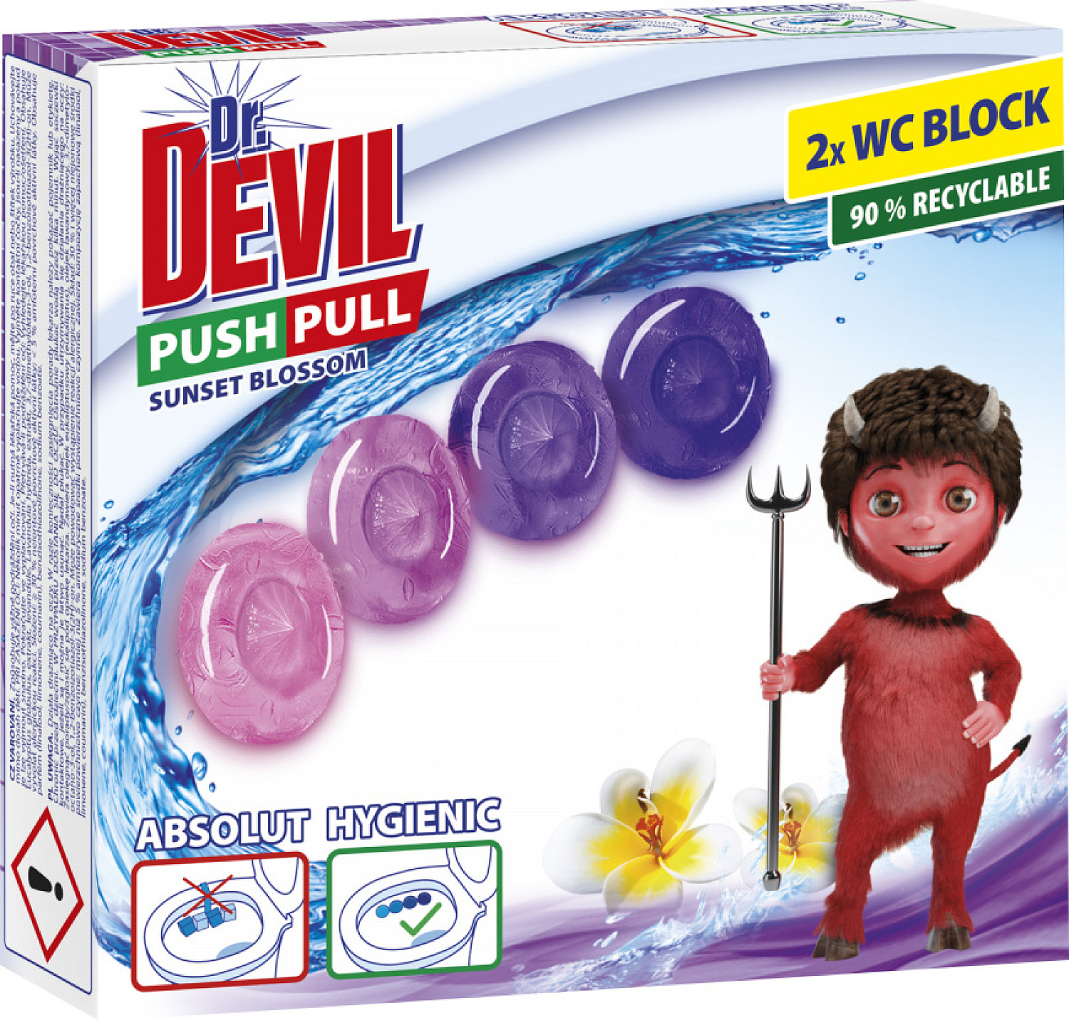 ABSOLUTNIE HIGIENICZNY - bez koszyka pełnego bakterii, wirusów i zanieczyszczeń, to jest Dr. DEVIL PUSH PULL GEL. Pierwszy blok WC bez koszyka. Świeżo pachnie, czyści i zapobiega osadzaniu się kamienia wodnego.
