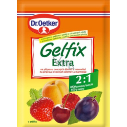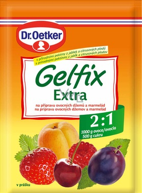 Gelfix Extra směs v prášku na přípravu ovocných džemů a marmelád s pektiny z jablek a citrusových plodů. 2:1 1000 g ovoce a 500 g cukru. S Gelfixem Extra 2:1 spotřebujete pouze polovinu cukru. Tato želírovací směs zachovává přirozenou chuť ovoce a současně odpovídá moderním požadavkům na zdravou výživu.