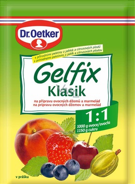 Gelfix Klasik mieszanka w proszku do przygotowania dżemów i marmolady z pektyn z jabłek i owoców cytrusowych. 1:1 1000 g owoców i 1150 g cukru. Tradycyjny środek żelujący do produkcji klasycznych słodkich marmolad, dżemów i galaretek.